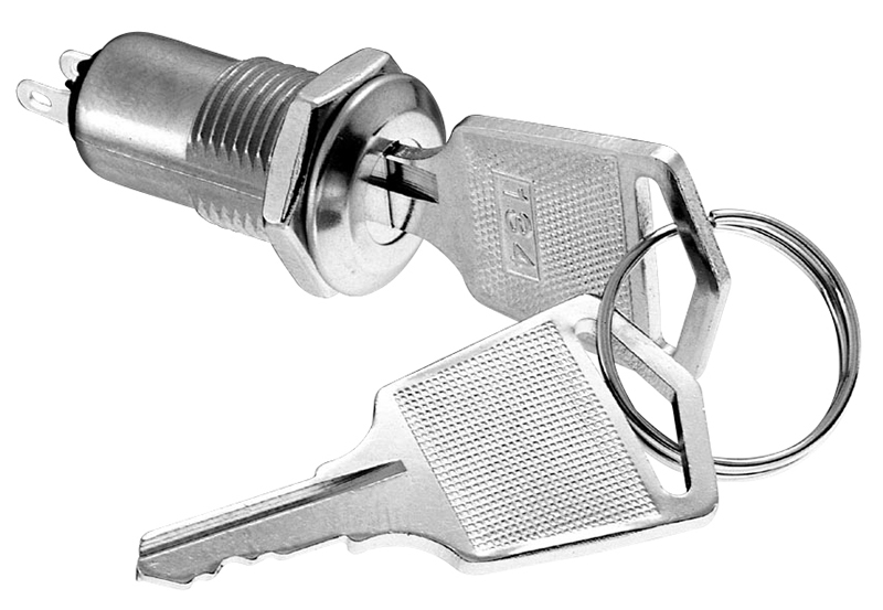 . 锌合金锁壳, 锁心. 锁壳包白铁盖. 滚铬电镀. 4个排片. 铜钥匙, 镀镍. S1091BA握柄包胶套. 钥匙可单抽或双抽. 镀银接点及端子. 2支端子, 通电方式off-on. 锁头固定方式为六角螺母