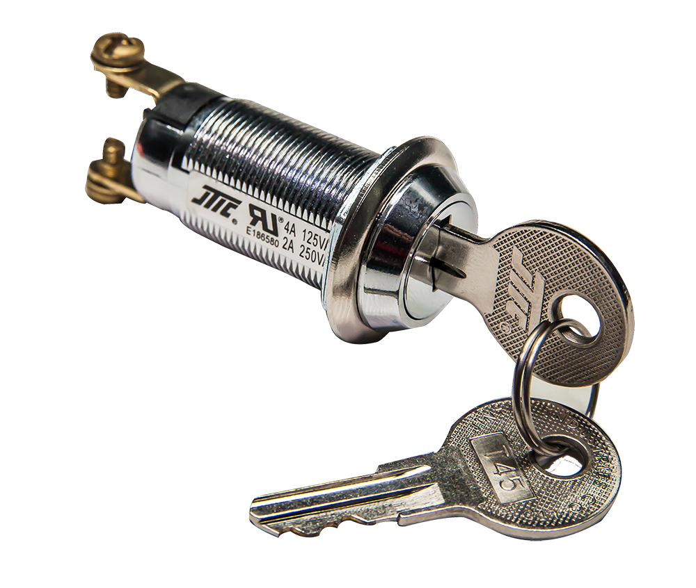 . 锌合金锁壳, 锁心, 亮铬电镀. 5个排片. 双边铣齿铜钥匙, 铜本色. 钥匙可单抽或双抽. 镀银接点及端子. 螺丝端子, 通电方式off-on. 锁头固定方式为六角螺母. 规格品为同号或100组钥匙组合. 最多有100组钥匙组合. UL认证