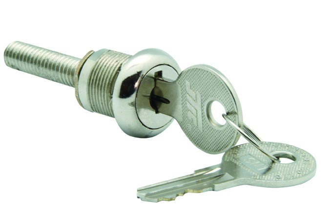 . 锌合金锁壳, 锁心. 亮镍电镀. 5个排片. 铜钥匙, 镀镍. 钥匙可每90度转向抽出. 螺杆标准尺寸为5/16”-18. “L” 标准尺寸为30.8mm, 可以依要求客製化. 锁头固定方式为六角螺母或插片